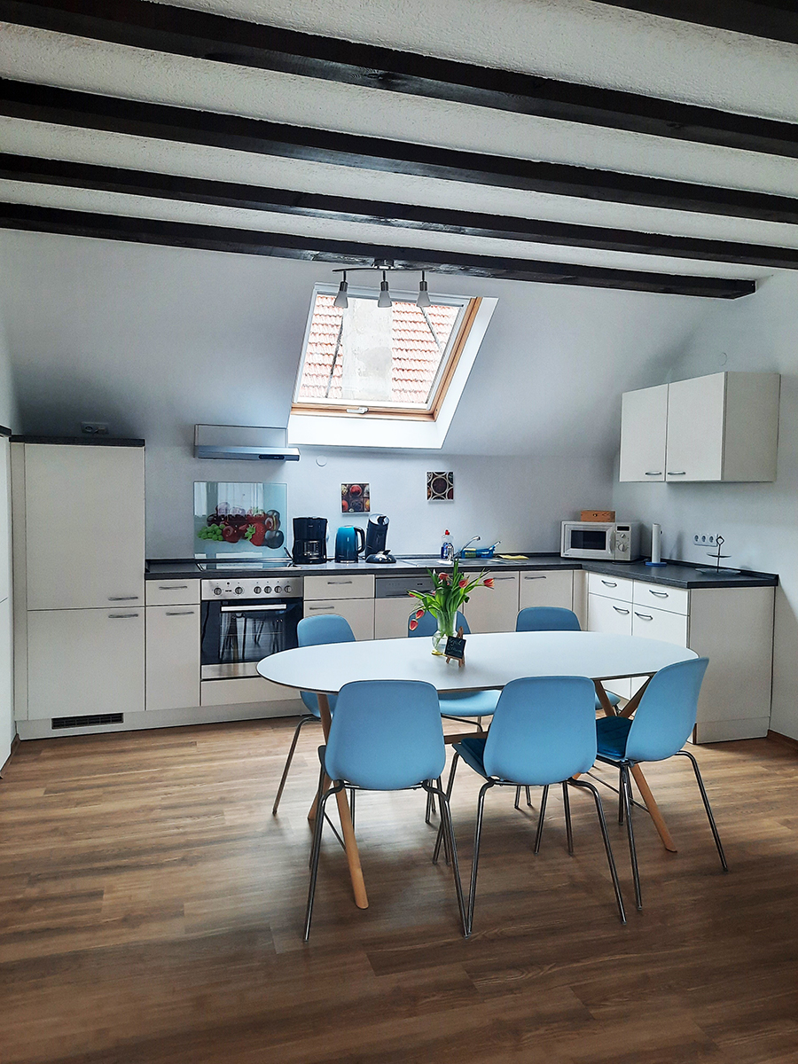- Kücheneinrichtung: Herdplatte, Backofen, Kühlschrank mit Eisfach, Mikrowelle, Kaffeemaschine (mit Filter oder Senseo), Wasserkocher, Toaster, Spülmaschine.